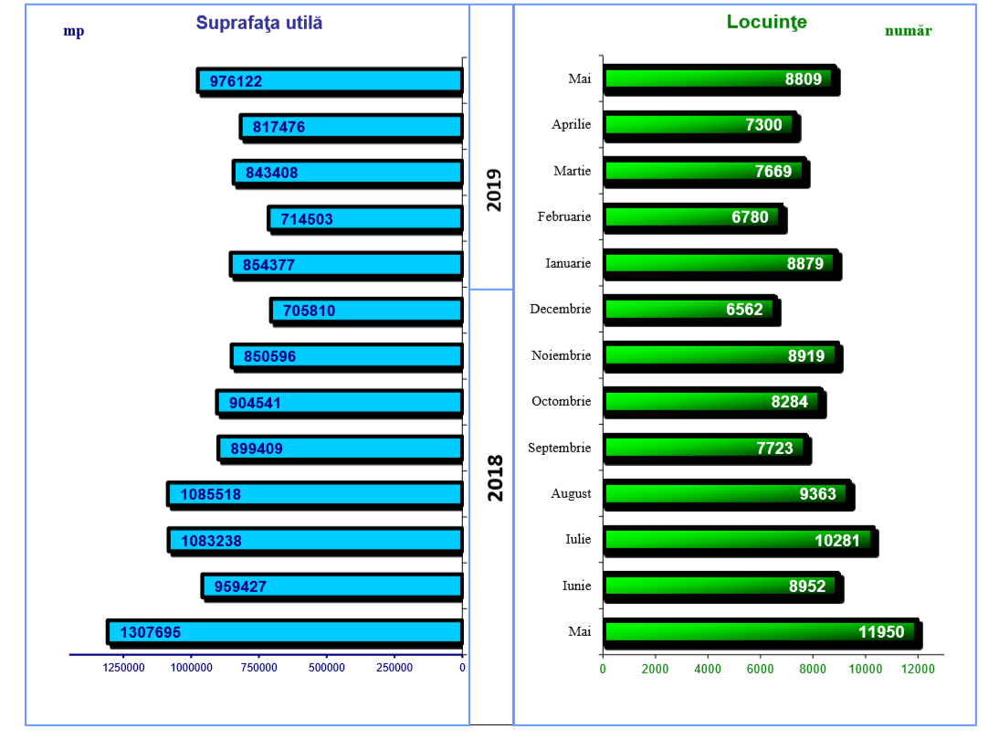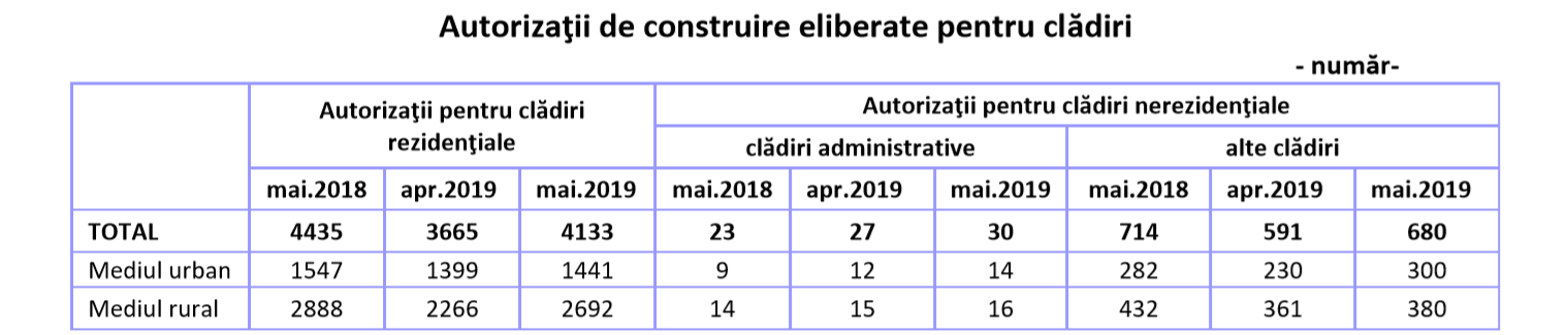 În luna mai 2019, faţă de aceeaşi lună a anului precedent, se remarcă o scădere a numărului de autorizaţii de construire eliberate pentru clădiri rezidenţiale (-302 autorizaţii), scădere reflectată în următoarele regiuni de dezvoltare: Vest (-189 autorizaţii), Nord-Vest (-70), Bucureşti-Ilfov (-67) şi Centru (-60). Creşteri au fost în următoarele regiuni de dezvoltare: Sud-Vest Oltenia (+32 autorizaţii), Sud-Est (+24), Sud-Muntenia (+15) şi Nord-Est (+13) .