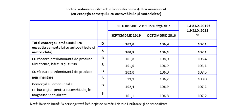 Volumul cifrei de afaceri din comerţul cu amănuntul (cu excepţia comerţului cu autovehicule şi motociclete), serie brută, în luna octombrie 2019, comparativ cu luna precedentă, a crescut pe ansamblu cu 2,0% datorită creşterilor înregistrate la comerţul cu amănuntul al carburanţilor pentru autovehicule în magazine specializate (+2,4%), vânzările de produse nealimentare (+2,0%) și la vânzările de produse alimentare, băuturi şi tutun (+1,8%). Volumul cifrei de afaceri din comerţul cu amănuntul (cu excepţia comerţului cu autovehicule şi motociclete), serie ajustată în funcţie de numărul de zile lucrătoare şi de sezonalitate, în luna octombrie 2019, comparativ cu luna precedentă a crescut pe ansamblu cu 0,8% datorită creşterilor înregistrate la comerţul cu amănuntul al carburanţilor pentru autovehicule în magazine specializate (+1,1%) și la vânzările de produse alimentare, băuturi şi tutun (+1,0%). Vânzările de produse nealimentare au scăzut cu 0,1%.