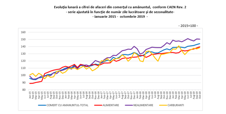 Volumul cifrei de afaceri din comerţul cu amănuntul (cu excepţia comerţului cu autovehicule şi motociclete), serie ajustată în funcţie de numărul de zile lucrătoare şi de sezonalitate, în luna octombrie 2019, comparativ cu luna octombrie 2018 a înregistrat o creştere cu 6,4% datorită creşterilor din vânzările de produse alimentare, băuturi şi tutun (+6,9%), comerţul cu amănuntul al carburanţilor pentru autovehicule în magazine specializate (+6,8%) și din vânzările de produse nealimentare (+6,2%).
