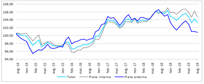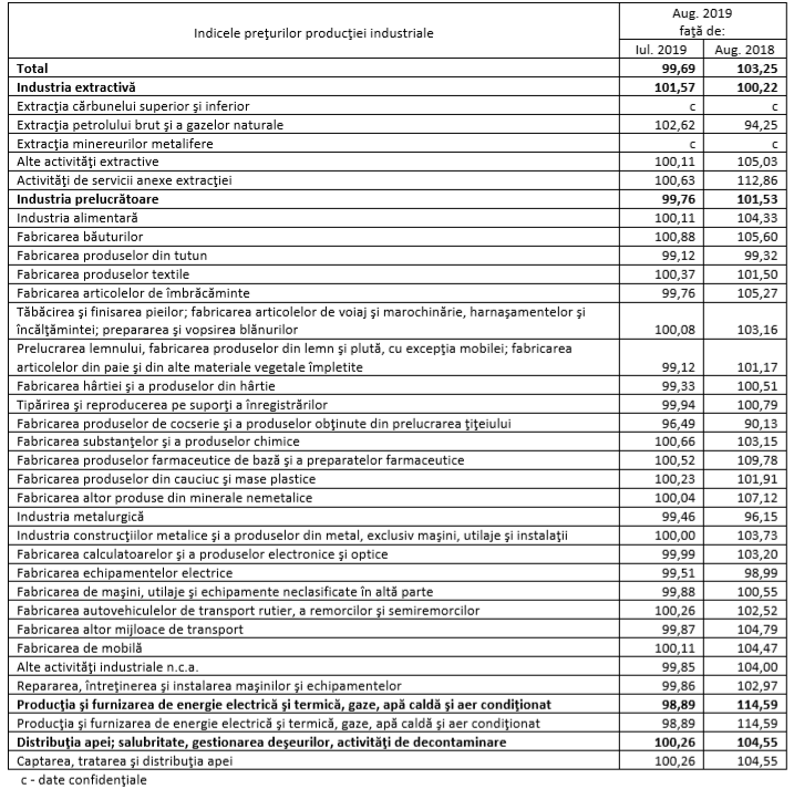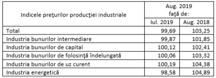 - În luna august 2019, preţurile producţiei industriale pe total (piaţa internă şi piaţa externă) au scăzut cu 0,3% faţă de luna iulie 2019.