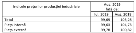 - În luna august 2019, comparativ cu luna august 2018, preţurile producţiei industriale pe total (piaţa internă şi piaţa externă) au crescut cu 3,3%.
