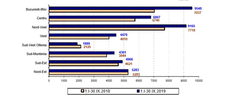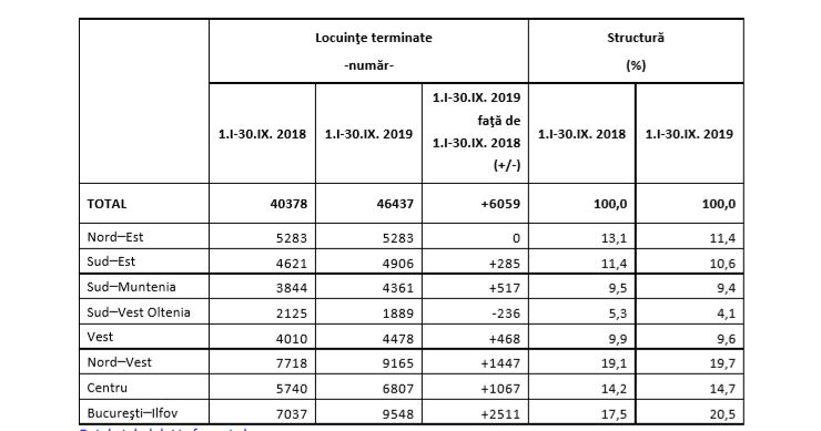 Distribuţia în profil regional în perioada 1.01-30.09.2019 faţă de perioada 1.01-30.0+.2018, pune în evidenţă o creştere a numărului de locuinţe terminate, în următoarele regiuni de dezvoltare: Bucureşti–Ilfov (+2511 locuinţe), Nord–Vest (+1447), Centru (+1067), Sud-Muntenia (+517), Vest (+468) şi Sud– Est (+285). În regiunea de dezvoltare Nord–Est s-a realizat acelaşi număr de locuinţe, faţă de perioada 1.I-30.IX.2018. În regiunea de dezvoltare Sud–Vest Oltenia numărul de locuinţe terminate în perioada 1.I-30.IX.2019 a scăzut față de perioada 1.01-30.09.2018 (-236 locuinţe).