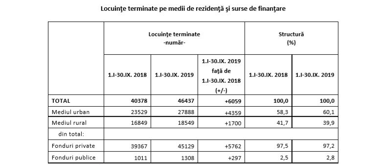 Pe medii de rezidenţă, în perioada 1.01-30.09.2019, cele mai multe locuinţe au fost date în folosinţă în mediul urban, ca pondere reprezentând 60,1% din total. Repartiţia pe surse de finanţare a locuinţelor terminate relevă faptul că, în perioada 1.01-30.09.2019, faţă de perioada 1.01-30.09.2018, a crescut atât numărul locuinţelor realizate din fonduri private (+5762 locuinţe), cât şi numărul locuinţelor realizate din fonduri publice (+ 297 locuinţe).
