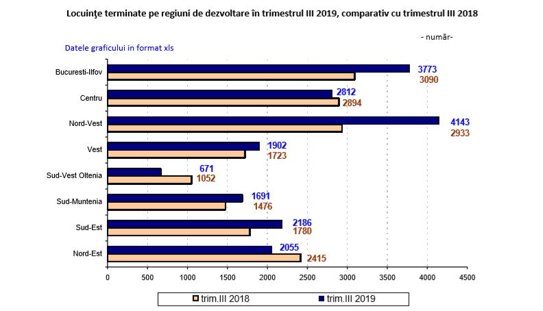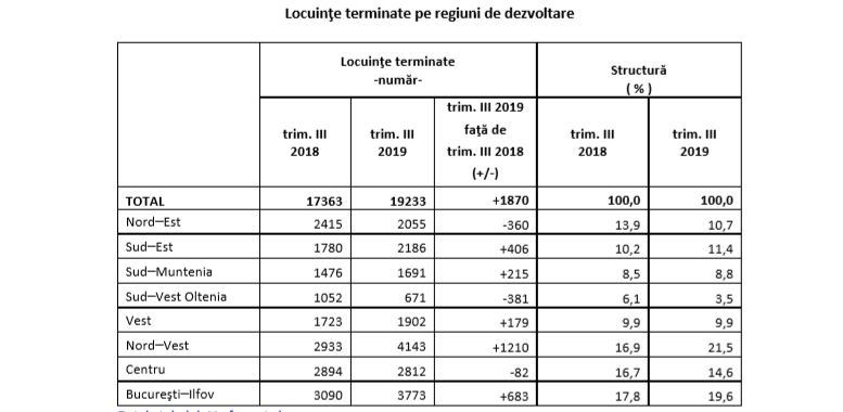 Distribuţia în profil regional în trimestrul III 2019 comparativ cu trimestrul III 2018, evidenţiază o creştere a numărului locuinţelor terminate în următoarele regiuni de dezvoltare: Nord–Vest (+1210 locuinţe), Bucureşti–Ilfov (+683), Sud-Est (+406), Sud–Muntenia (+215) şi Vest (+179). Scăderi au avut loc în următoarele regiuni de dezvoltare: Sud–Vest Oltenia (-381 locuinţe), Nord–Est (-360) şi Centru (-82).