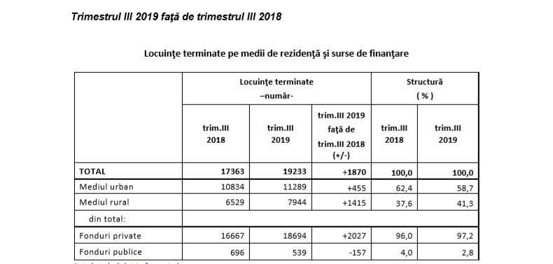 În trimestrul III 2019 au fost date în folosinţă 19233 locuinţe, în creştere cu 1870 locuinţe, faţă de trimestrul III 2018.